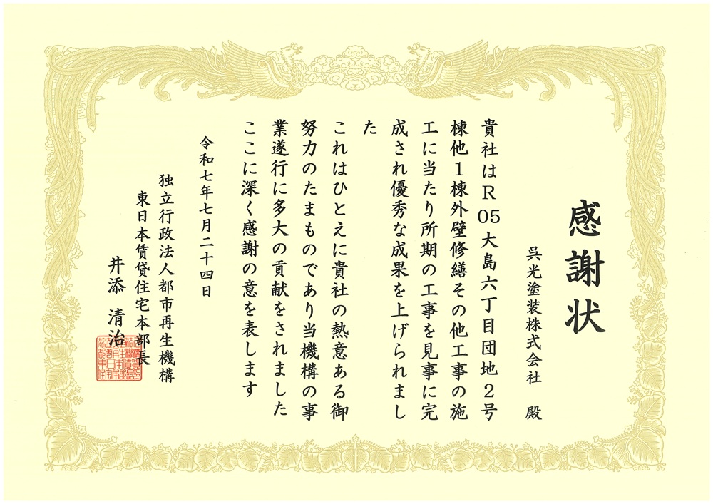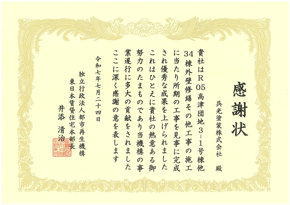 都市再生機構「令和7年度優秀工事表彰」感謝状 授与